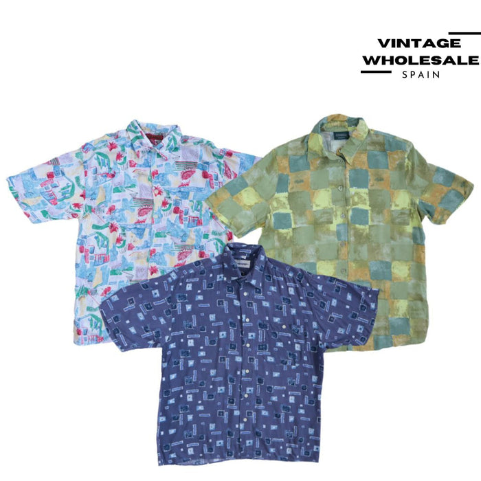 Cada lote incluye una mezcla variada de camisas crazy vintage de manga corta, con diseños abstractos, florales, geométricos o completamente impredecibles. Todas las prendas son seleccionadas de stock europeo y estadounidense, con 90 % en grado A, listas para la venta.