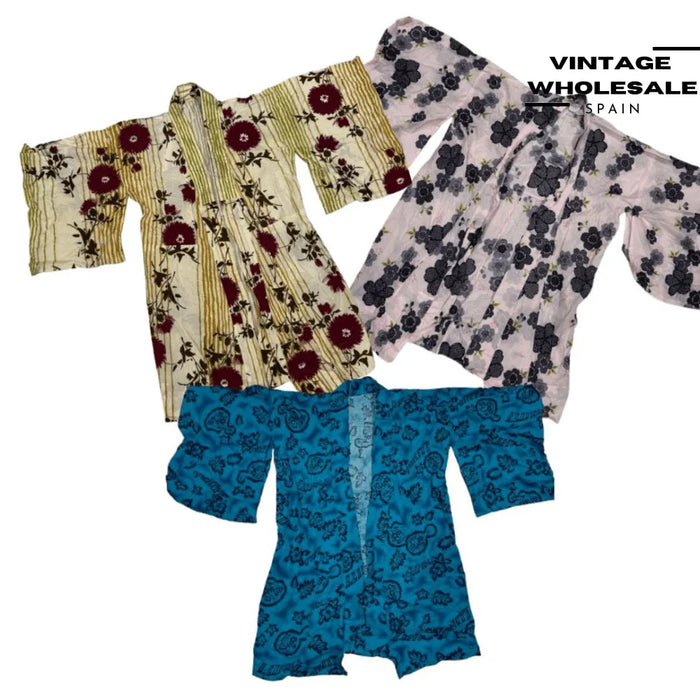 Nuestro mix de kimonos cortos de algodón ofrece una selección curada de prendas ligeras, transpirables y con un diseño único de inspiración oriental. Estos kimonos cortos son ideales tanto para el día a día como para ocasiones especiales, convirtiéndose en una adición versátil a cualquier guardarropa. Disponibles en lotes al por mayor de 10 kg, 20 kg, 45 kg y 100 kg, son una excelente opción para minoristas que buscan ropa exclusiva y de alta calidad.